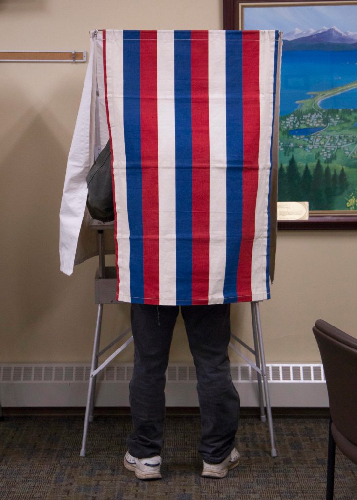 A voter uses the privacy curtain to cast his ballot at the Homer City Hall on Oct. 5. (Photo by Sarah Knapp/Homer News)