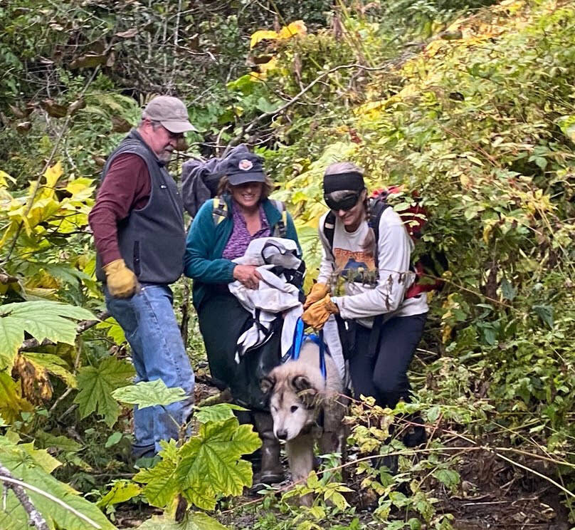 Sarns said their journey into the ravine was slow going, with wrong turns and too many run ins with devil’s club, but eventually the group was able to make their way to where Ireland was waiting with the dogs. With multiple chainsaws cutting through the fallen trees and overgrowth, the team knew they could get out since they were working together. After geting the dogs some food, they harnessed Allie and put a large canvas sling with handles underneath Thunder to help him walk and began the trek home.