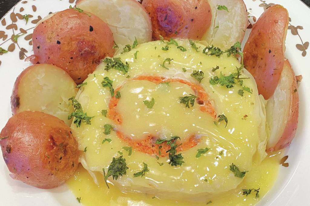 This week I decided to challenge myself to make a dinner using only what I had in my freezer and pantry and, as an added challenge, the main components must have been grown or caught here in Alaska. I came up with a salmon-stuffed roasted cabbage head with rosemary potatoes and a lemon beurre blanc.