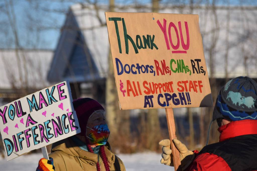Two groups with competing messages gathered near Central Peninsula Hospital on Saturday — some to cheer on local health care workers, others to protest vaccine mandates and promote the use of alternative treatments for COVID-19.