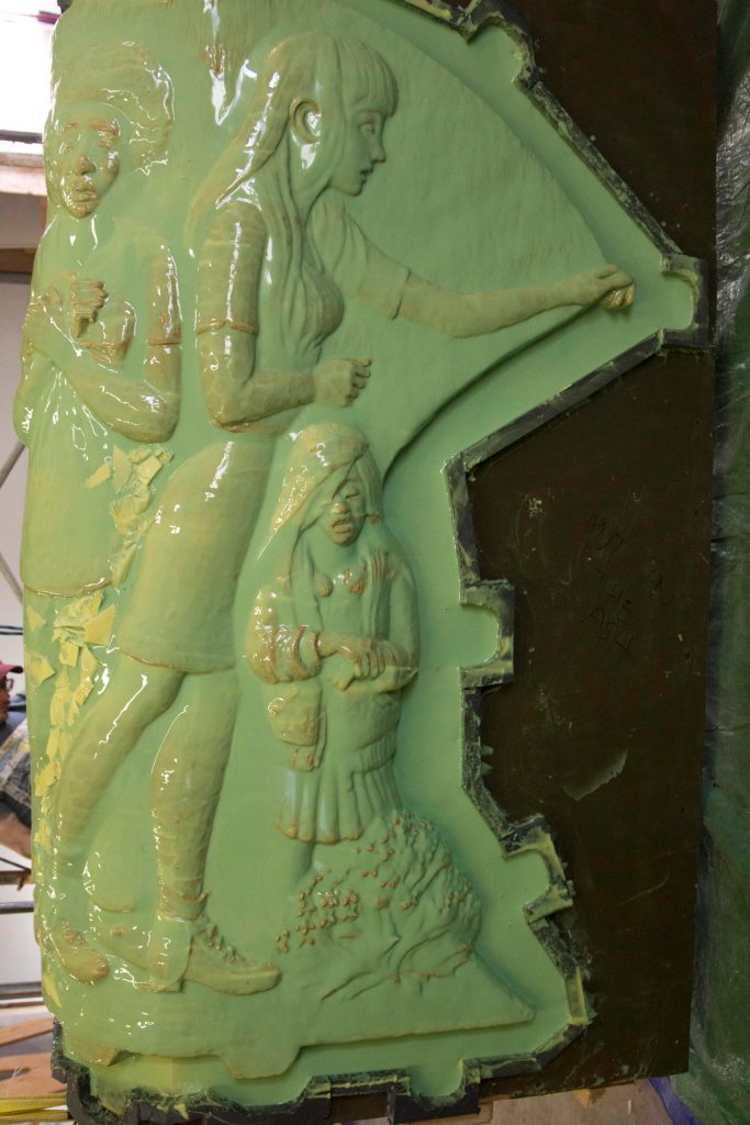 The original artwork was sculpted in molding clay by Hughes, which features mourning characters of all ages and ethinicities. As the base coat of rubber was poured on the design, it captured the design’s smallest details while the additional layers created a solidified mold for casting. As the bench supports are rounded, the clay base has to be rotated 90 degrees each time the mold is poured to allow for even coverage.