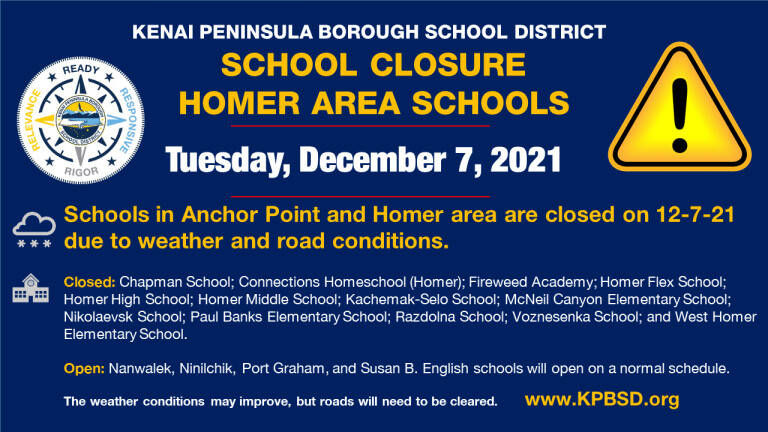 Because of a continuing winter storm that started Sunday night, Kenai Peninsula School District schools in the Homer and Anchor Point area will be closed on Tuesday, Dec. 7, according to a notice from the school district on Monday evening.