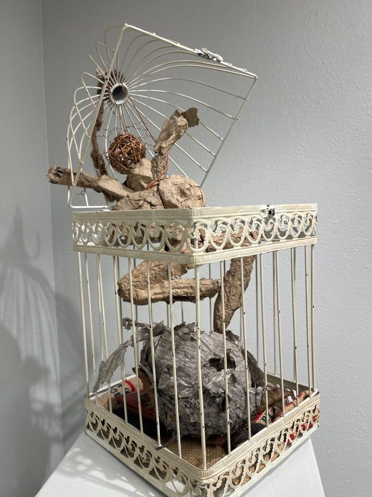 Another piece features a figure lifting themselves from the inside of a small bird cage, away from the wasp nest that rests at the bottom. It’s one of three works of art in the show titled “Leaving the past behind me.”
