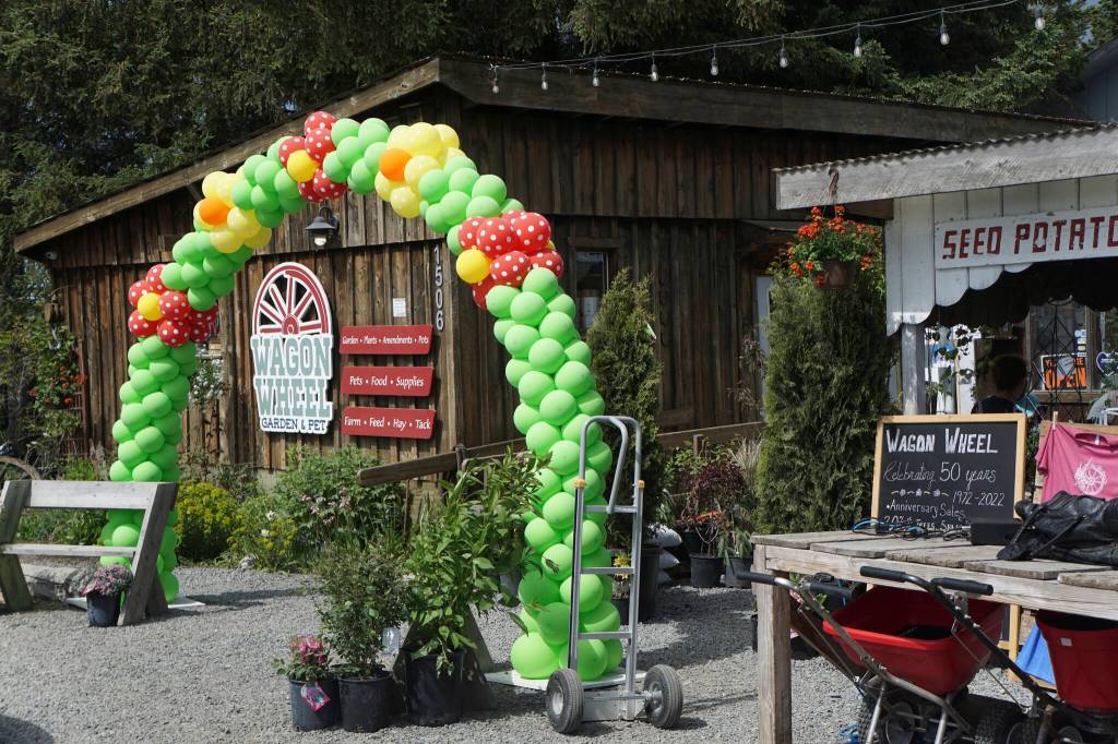 Wagon Wheel Garden & Pet, the iconic store known for its playful “Pick Up Chicks Here” sign on the way to the Homer Spit, celebrated its 50th anniversary last Friday. A balloon arch decorated the entrance to the rustic wooden store, and visitors browsed the gardens looking for deals on flowers, vegetable starts, and pet and stock feed.