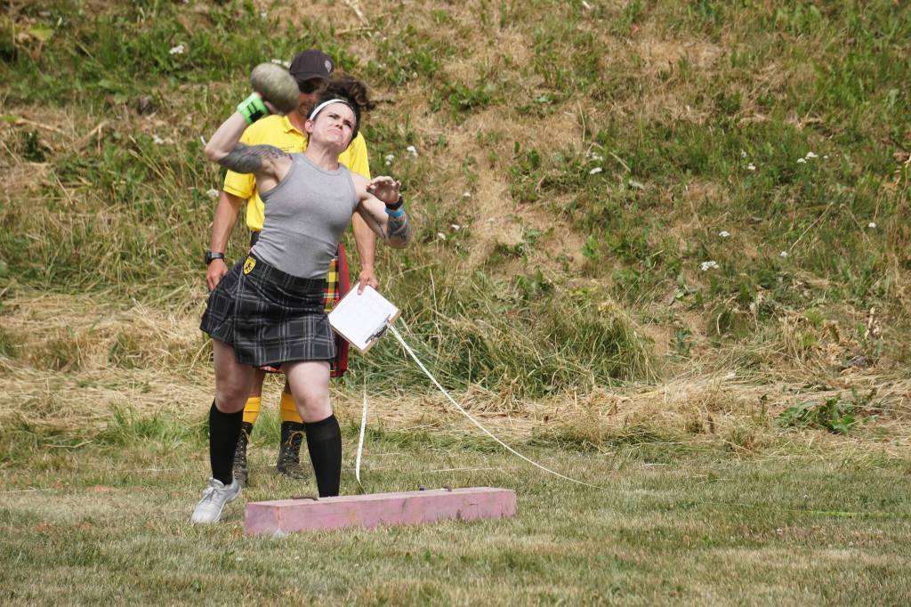 Norma jean Farr throws the Braemar stone at the Kachemak Bay Highland Games on Saturday, July 2, 2022, at Karen Hornaday Park in Homer, Alaska. (Photo by Michael Armstrong)