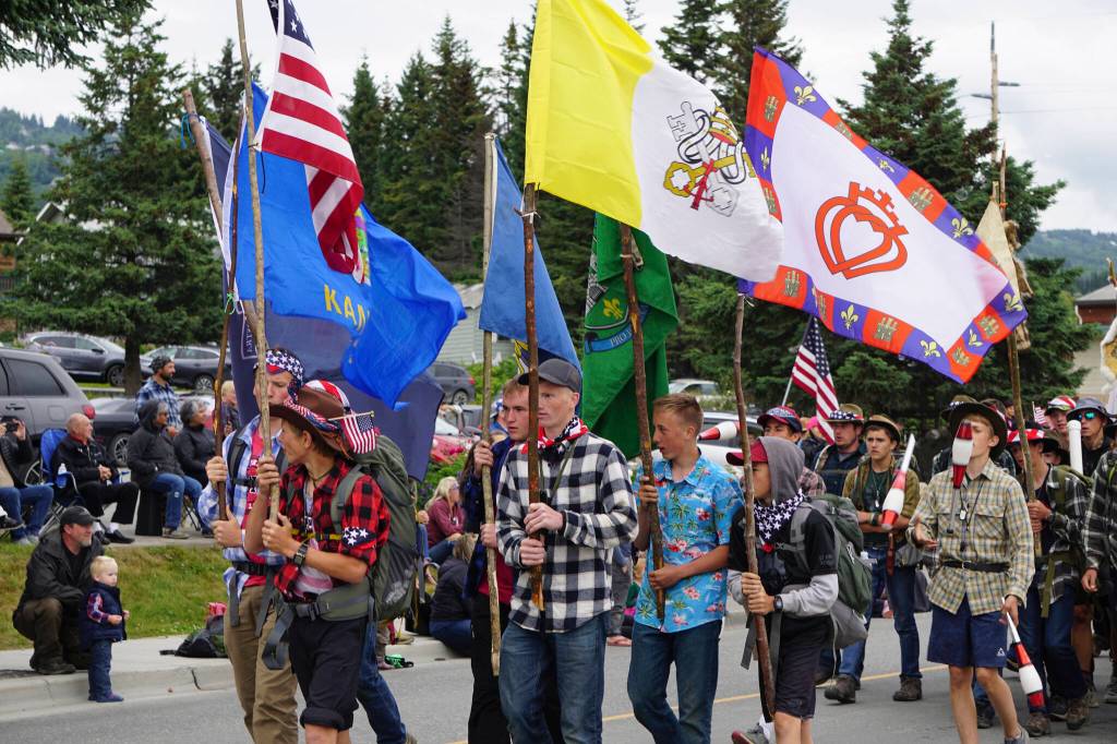 Young men from St. Mary’s Academy, St. Mary’s, Kansas, and members of the Knights of Immaculata, march in the Homer Fourth of July parade on Monday, July 4, 2022, on Pioneer Avenue in Homer, Alaska. The group of about 50 men and boys camped in Homer as part of their trip. The group won Best in Show for the parade. (Photo by Michael Armstrong/Homer News)
