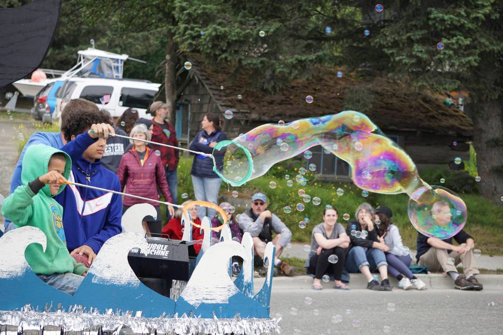 Children on the Seldovia Village Tribe float blow giant bubbles during the Homer Fourth of July parade on Monday, July 4, 2022, on Pioneer Avenue in Homer, Alaska. (Photo by Michael Armstrong/Homer News)