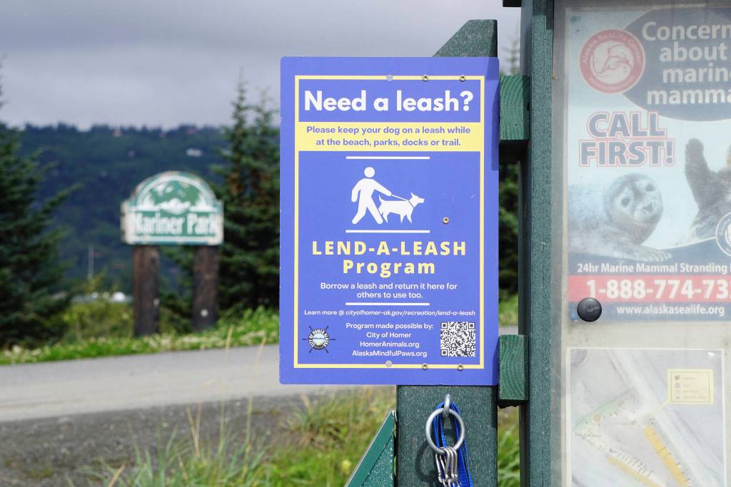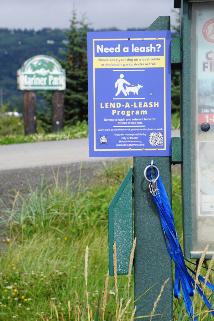 Lend-A-Leash makes “leashes readily available to borrow if you do not have one to use,” as stated on the City of Homer website. Lend-A-Leash stations are maintained at popular dog-walking locations across Homer, such as Mariner Park and the Poopdeck Trails.