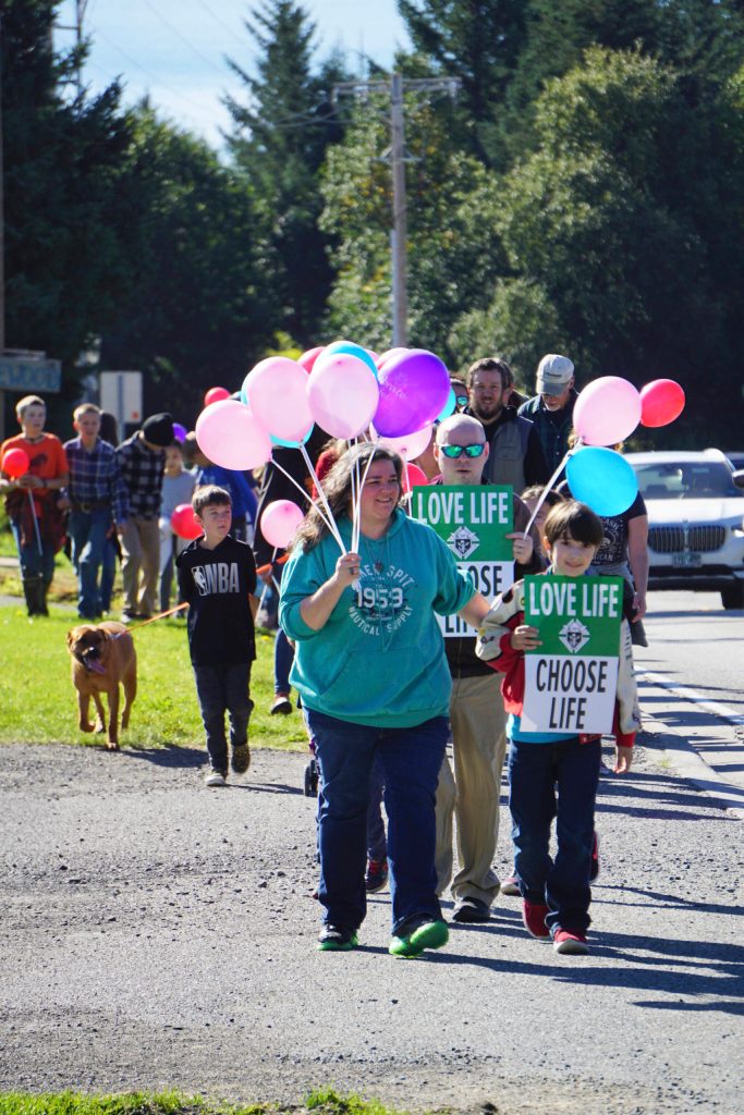 Carrying pink, blue and purple balloons and carrying signs that read “Love Life — Choose Life,” about 140 people marched along Pioneer Avenue and Bartlett Street on Labor Day in the Walk For Life.