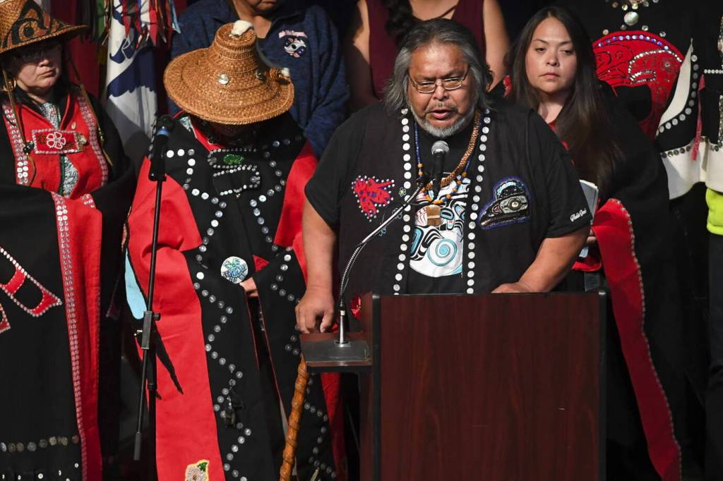 Joel Jackson, president of the Organized Village of Kake and a featured presenter at the Government-to-Government Violence Against Women Tribal Consultation in Anchorage on Wednesday, speaks during a memorial service at Juneau-Douglas High School: Yadaa.at Kalé on Friday, June 7, 2019. (Michael Penn / Juneau Empire File)