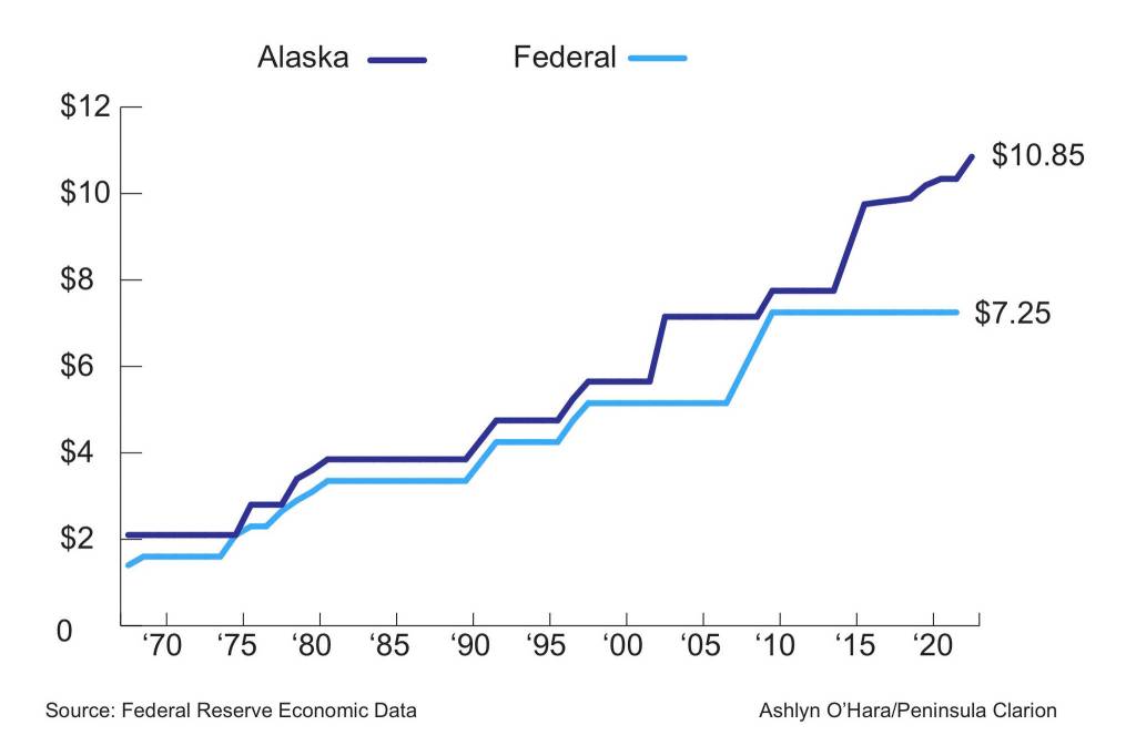 Federal Reserve Economic Data, which is created and maintained by the Federal Reserve Bank of St. Louis, show that Alaska’s state minimum wage has historically been higher than the federal minimum. The federal minimum wage has not increased since 2009, when it jumped from $6.55 to $7.25, FRED data show.