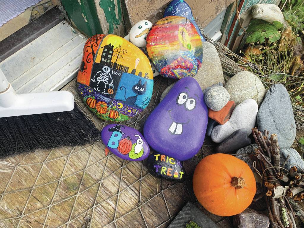 A festive doorway includes a pumpkin, broom and painted rocks by Homer Rocks and Anchorage rocks members, photo by Christina Whiting