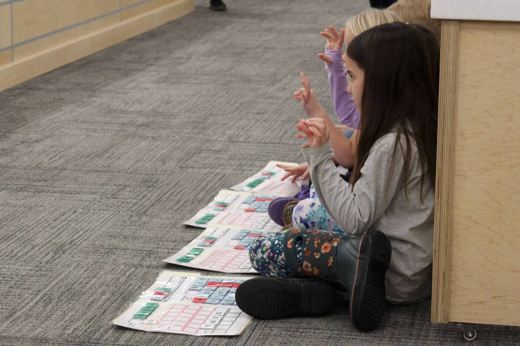 Teacher Callie Giordano demonstrated “word building,” which comes from the University of Florida’s Literacy Institute. Students followed along while Giordano tapped out sounds in words like “block” on her fingers.