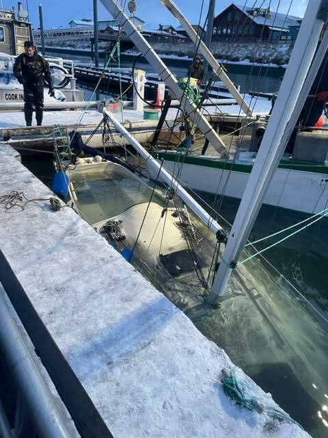Matt Clarke and Homer Harbor crew assess vessel sunk vessel in Homer Harbor on Dec. 27, 2022. (Photo provided by Harbor crew)