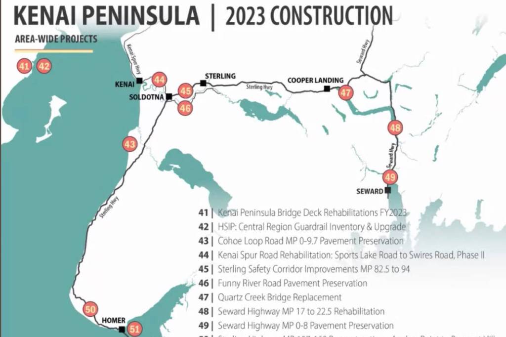As part of the presentation, Post showed a map of 2023 construction projects on the Kenai Peninsula. Two are area wide, including “rehabilitations” on all Kenai Peninsula bridge decks and an inventory and upgrade of guardrails.