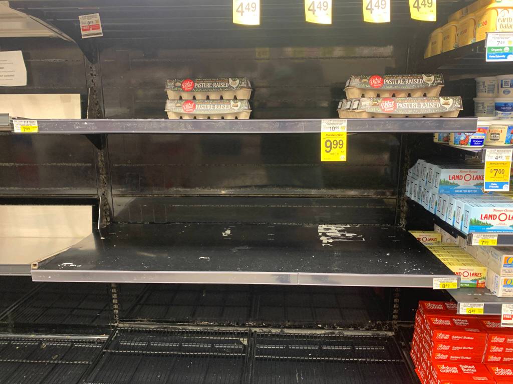 An egg shelf at Safeway is mostly empty, Jan. 23, 2023, in Homer, Alaska. (Photo by Christina Whiting)
