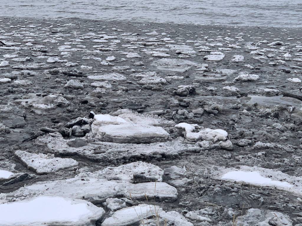High tides bring mud and ice to the shoreline along the Homer Spit Road, Jan. 22, 2023, in Homer, Alaska. (Photo by Christina Whiting)