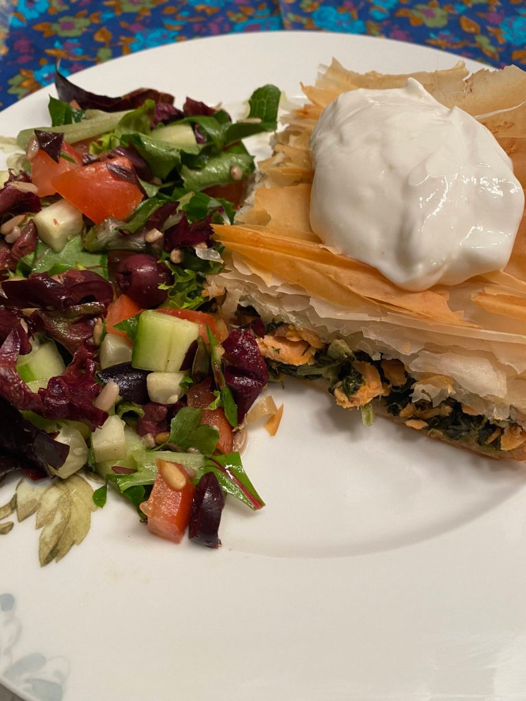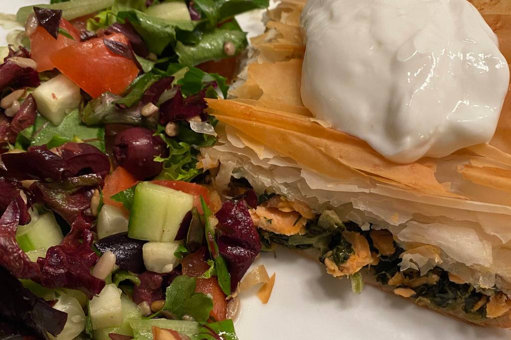 I had a few jars of home-canned salmon left (a thoughtful gift from my mother-in-law) which I must not allow to expire, and two more boxes of that phyllo dough that deserves to be enjoyed, so I used some of each to make spanakopita — Alaska style.