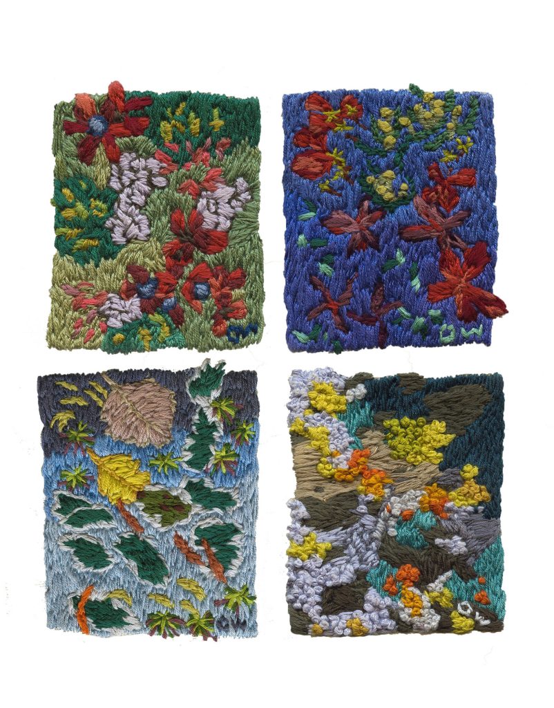 While her primary medium is gouache on paper or claybord panels, she continuously experiments with other mediums. Recently, her work has shifted from depictions of women in the fishing industry to place-based observational nature studies, merging techniques of scientific illustration, nature journaling, and landscape painting. She experiments with an instinct to curate and collect inspired by the cabinets of curiosities, painting plants and animals that are commonplace, their wildness obscured by familiarity. With the slow turn from winter to spring, her work for this show has grown more whimsical, eclectic, and experimental and she chose to create series of small pieces to explore themes that come up in her work and she returned to painting and sculpting the human figure, sometimes self-portraits and sometimes from imagination, contextualized within a nature scene, exploring the idea of being small and vulnerable in the environment, how it would be magical, but also frightening.