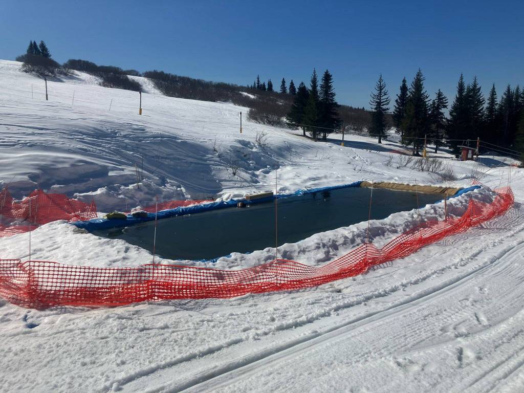 To create the pond, volunteers dig out a shallow pit in the snow and line it with tarps. The tarps that the Homer Rope Tow uses for the event are several years old. “The first time we lost the water we thought maybe a piece of ice popped through some of the tarp. We had to go through all the plastic and patch it up, it also happened the day before the event, it was a bummer,” coordinator Sammy Walker said.