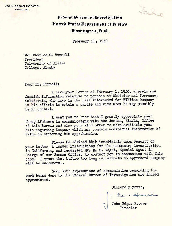 No record exists of Dempsey contacting Bunnell after his prison escape. Bunnell retired from the University of Alaska on July 1, 1949, and eventually retired to California, where he died of a heart attack on Nov. 1, 1956.