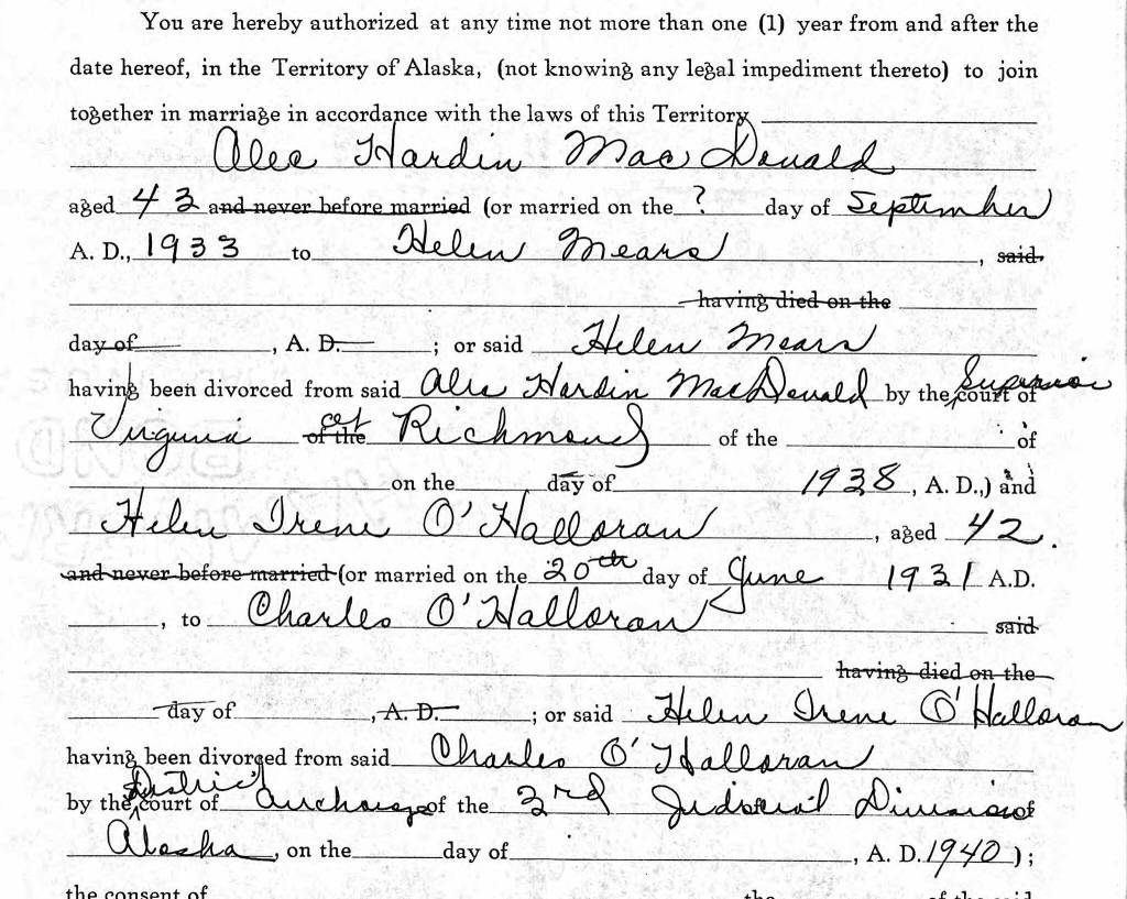 In his personal life, according to Soberg and news reports, MacDonald had met his wife, Helen, when they both were living in the village of Takotna in Interior Alaska. The 1940 U.S. Census shows him as a Takotna resident, a 39-year-old, divorced ARC truck driver. According to other documents, he married the thrice-divorced mother of seven, Helen Irene O’Halloran, on Aug. 25, 1943, in Fairbanks.