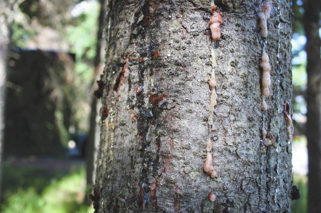 A common indicator of beetle presence is boring dust, similar to sawdust, which collects at the base of the infected tree and in bark crevices. The dust is pushed out of holes in the bark where beetles enter and clear tunnels under the bark. Pitch tubes, or red globs on the surface of the tree bark, are seen where the tree has tried to push the beetles out.