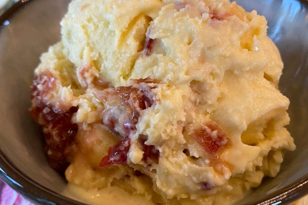 Homemade rhubarb ice cream is served. (Photo by Tressa Dale/Peninsula Clarion)