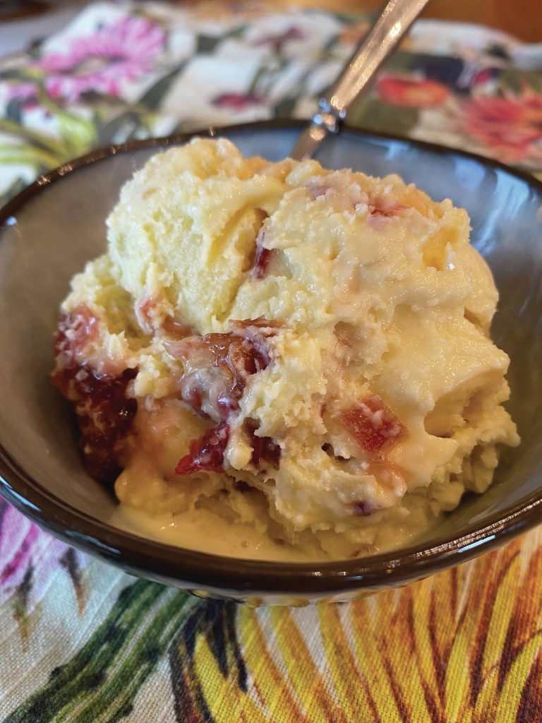 Homemade rhubarb ice cream is served.
