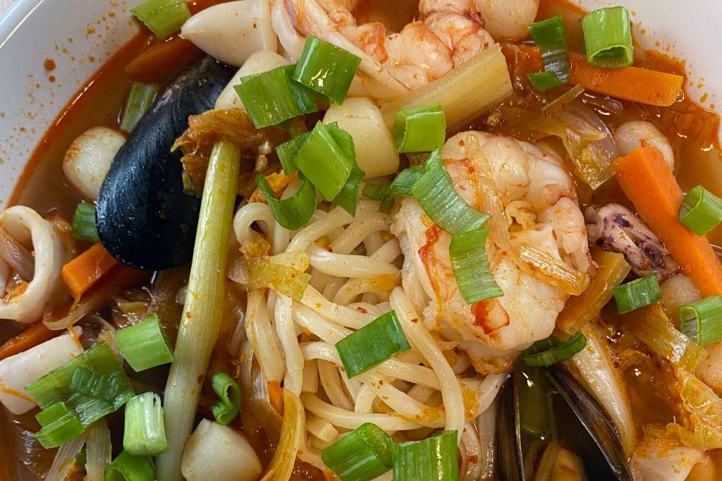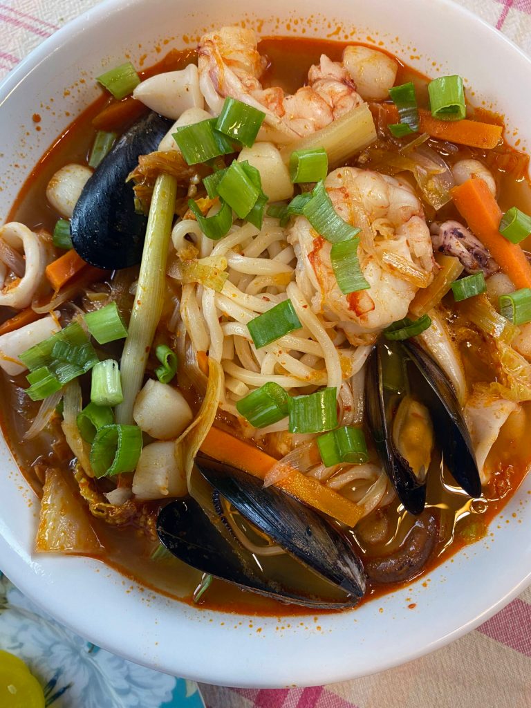 I find it strange how I would never dream about cooking and eating the creepy crawlies that live on land, but the many-legged creatures of the ocean are a welcome treat for my dinner. This Korean spicy seafood noodle soup, jjamppong, is served in a huge bowl loaded with springy noodles and tender seafood in a crimson broth.