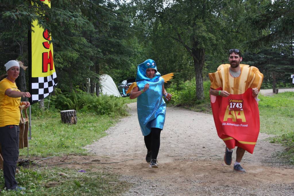“Fish and chips” costumed runners cross the finish line in the inaugural Great Salmon Run 5K race on Saturday, Aug. 5, 2023 during Salmonfest at the Kenai Peninsula Fairgrounds in Ninilchik, Alaska.