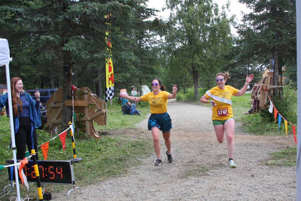 Sterling Watson, left, and Annie LaBine cross the finish line together in the inaugural Great Salmon Run 5K race on Saturday<ins>, Aug. 5, 2023</ins> during Salmonfest at the Kenai Peninsula Fairgrounds in Ninilchik<ins>,</ins> <ins>Alaska</ins>.