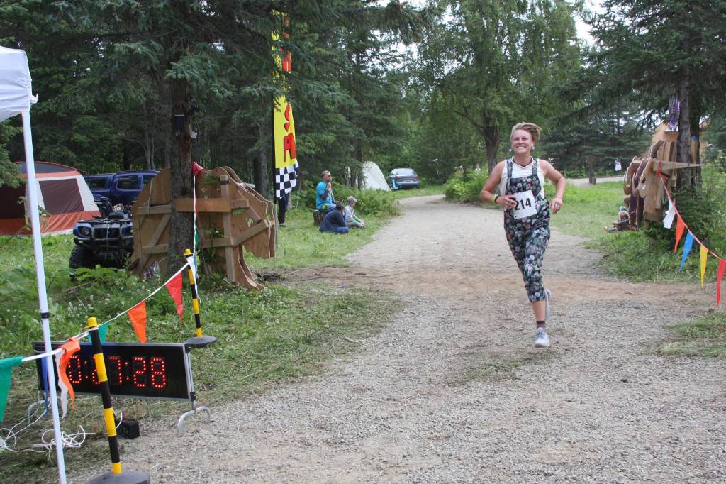 Emma Wilson smiles as she crosses the finish line in the inaugural Great Salmon Run 5K race on Saturday, Aug. 5, 2023 during Salmonfest at the Kenai Peninsula Fairgrounds in Ninilchik, Alaska. (Delcenia Cosman/Homer News)