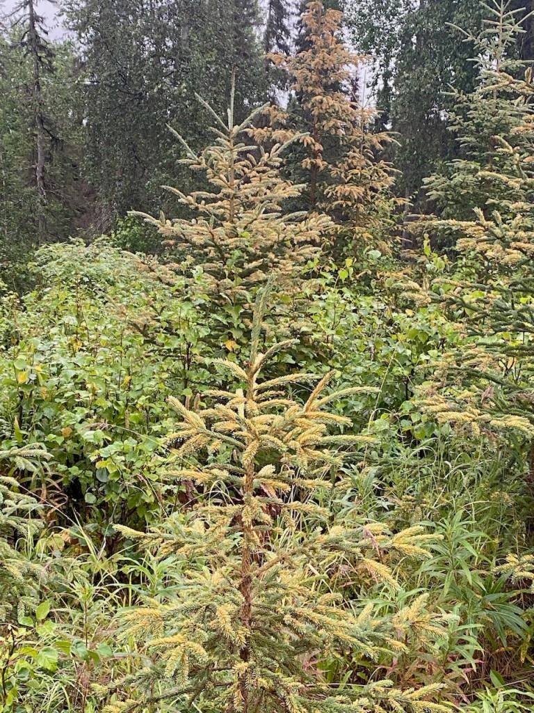 This year the fungus is its more familiar cousin, Chrysomyxa ledicola, which was reported on the Kenai Peninsula in 2017 and 2020. While rarely resulting in tree mortality, the year’s new growth will die and fall off, leaving this cohort of needles missing from the trees. Not to worry, healthy buds will form on the end of the branches, and the spruce will produce needles in the following year.