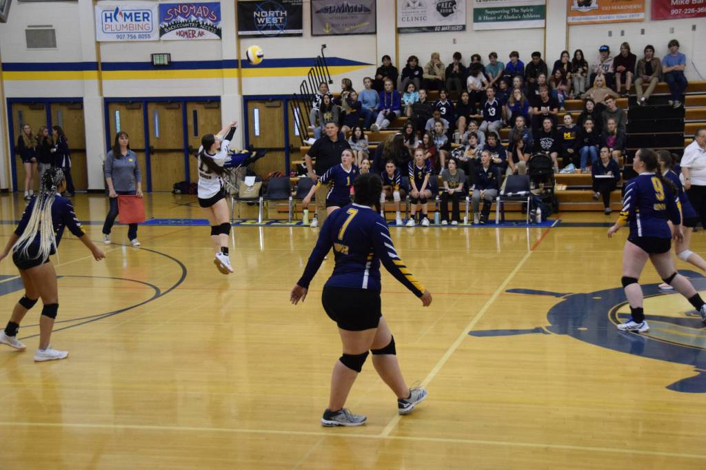 The highlight of the match was Game 2, where Homer had three game points and Soldotna won by cashing in on its fifth game point of the game. Soldotna’s Hallie Fischer finished off the game with a stuff block.