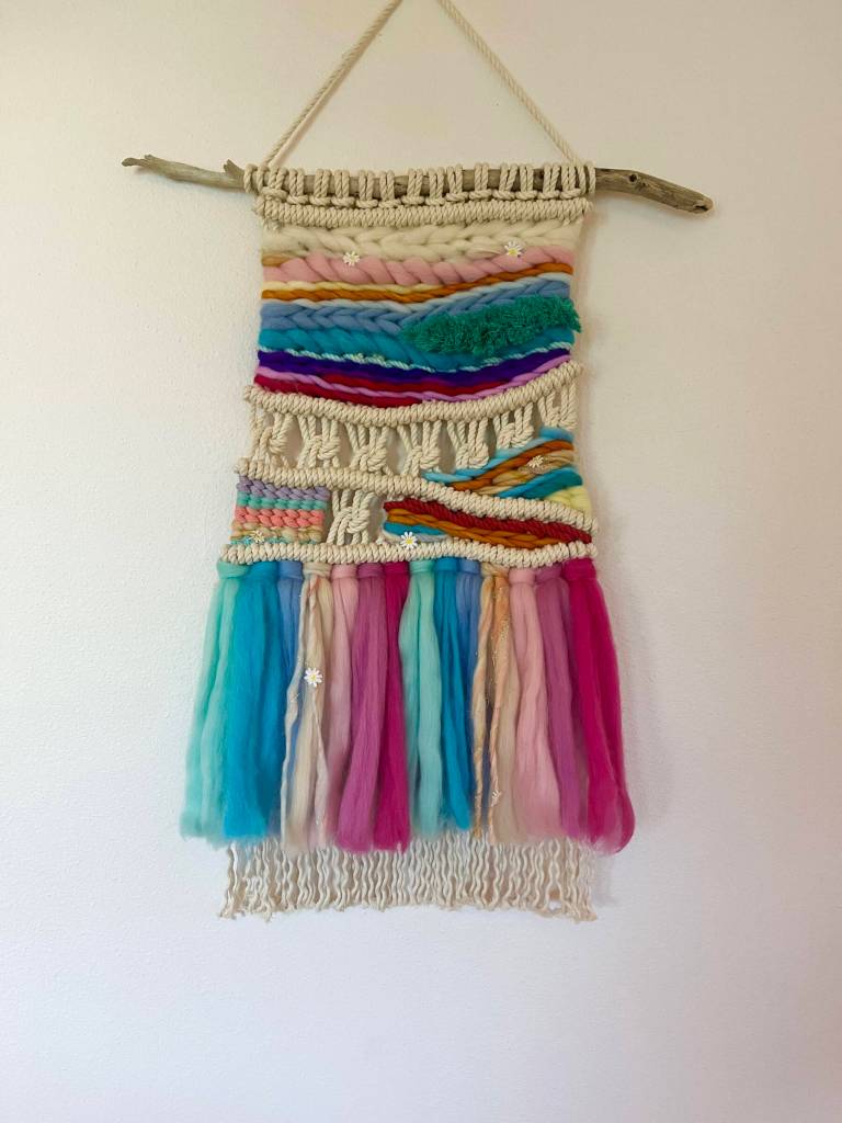“When I started out, I learned to gather my macramé rope, tie rows and rows of knots and add fringes and beads,” she said. “As I got more comfortable with what I was doing, I wanted to add color to the macramé pieces, which are typically neutral, because I love lots of color, and macraweaving provides this opportunity.”