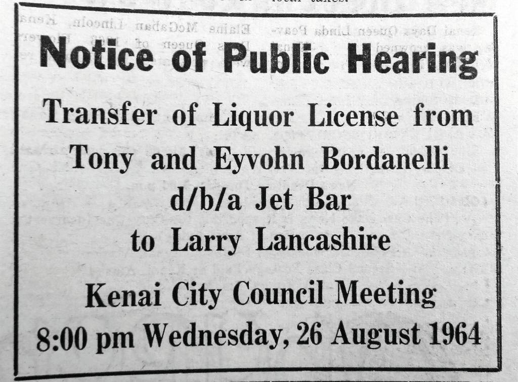 Larry Lancashire acquired the Bordenellis’ liquor license after a Kenai City Council public hearing in late August 1964. Shortly thereafter, Larry’s Club, a dining-and-drinking establishment, was born.