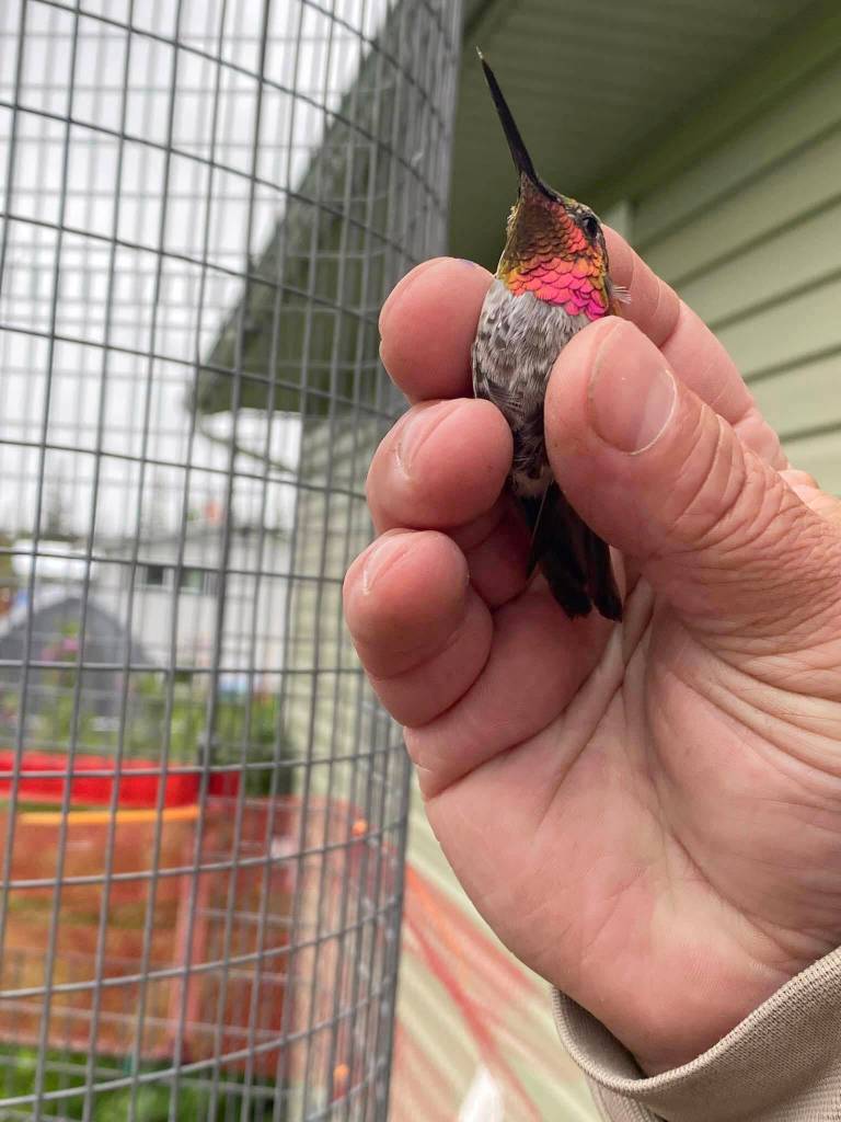 On June 23, 2023, we got a report of a hummingbird coming to a feeder near Soldotna High School. We investigated and found it was an adult Anna’s hummingbird. I quickly set up a trap and captured and banded the bird, which can only be done by trained and licensed banders.