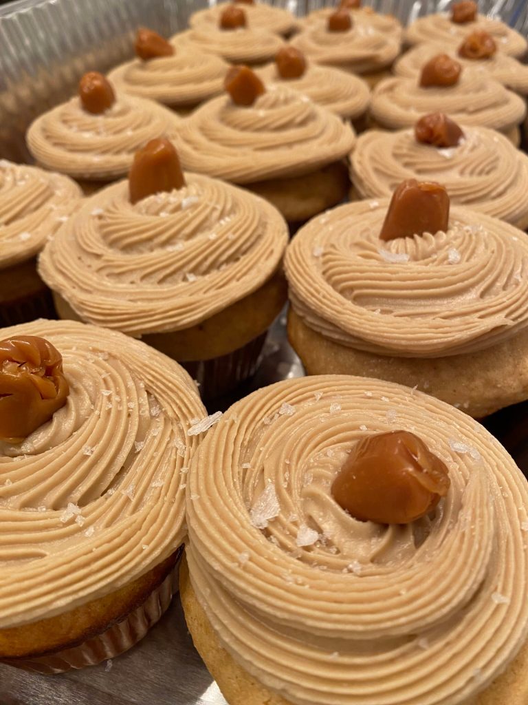 Now that I’m working with so many people, I have decided to reinstate cupcake Mondays as a little gift to myself. For my first offering I decided on a flavor my sister and I both love — salted caramel. These cupcakes are very sweet, but the flaked Maldon salt cuts and balances the sweetness so it isn’t cloying.