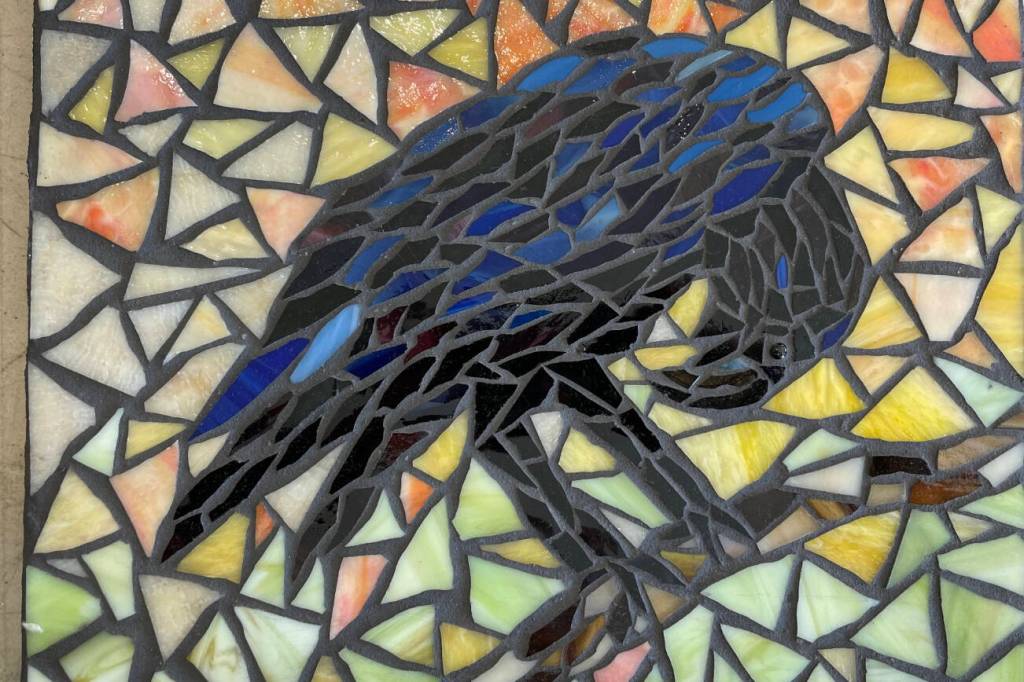 Confident in her beading and glasswork, Nelson began working with mosaics, using stained glass, pottery and tiles to create geometric and non-geometric designs by applying the pieces to a background, filling it in and grouting. Learning by reading art books and making small soap dishes and candleholders early on, she created her first mosaic design — a plate titled “Medicine Wheel” — for Bunnell’s annual plate project, her rendition of the plains Native American medicine wheel.