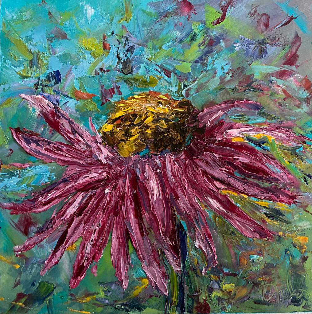 “I love the smooth, buttery texture of the paint and what I can do with a knife verses a brush,” she said. “Painters like to make that beautiful stroke with a paintbrush and I like to make it with my favorite knife.”