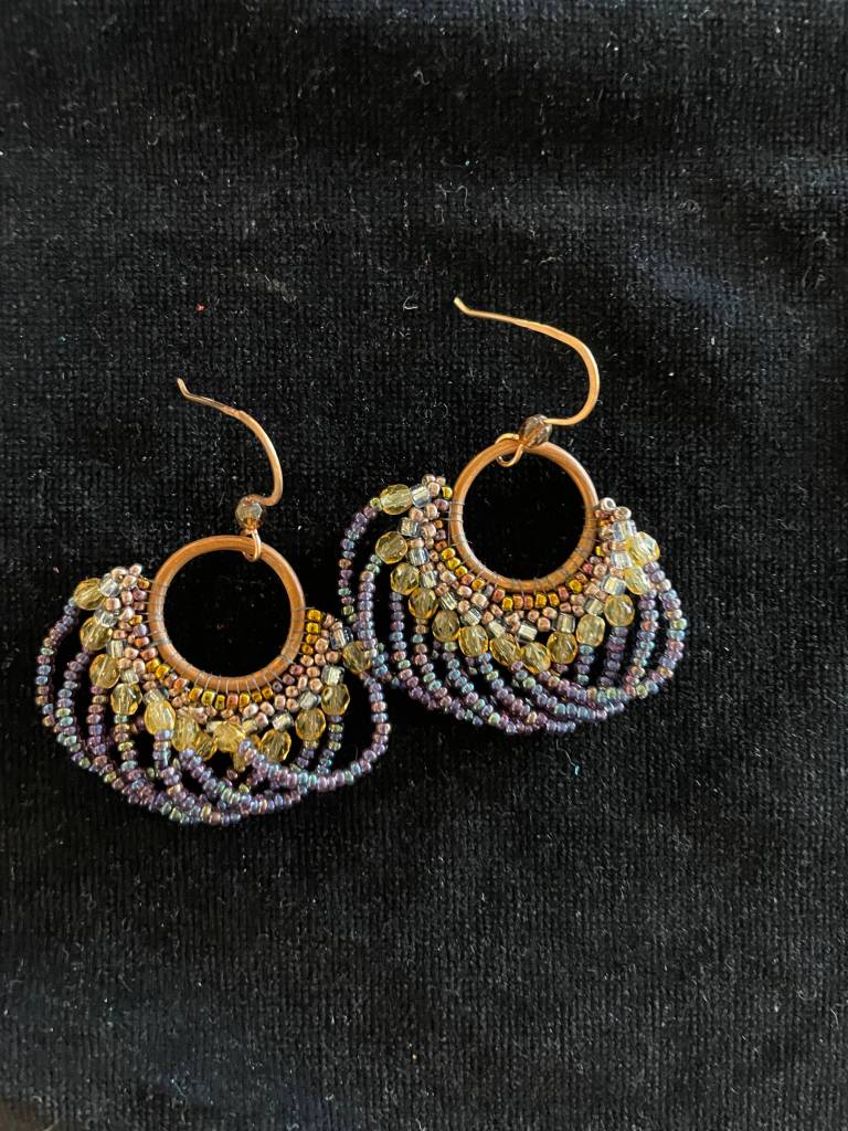 Reviving the needle art she learned from the women in her life, she began playing with beaded and stitched jewelry, teaching herself more and more advanced techniques. Today she refers to herself as a bead weaver, using high quality Japanese glass beads to stitch patterns and make designs, often incorporating precious stones and buttons as she weaves.