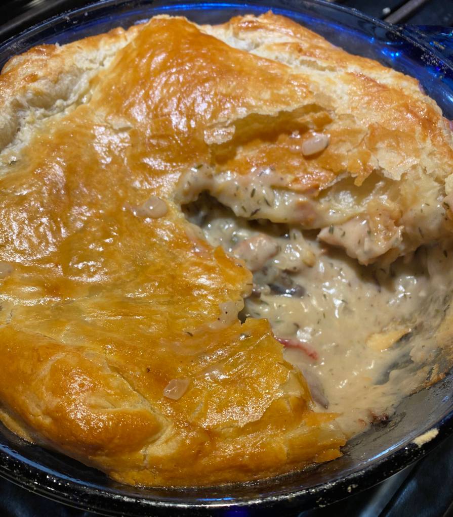 Return the cooked chicken, bacon, and mushrooms to the pan and stir. Turn off the heat and let it rest until ready to assemble the pie.