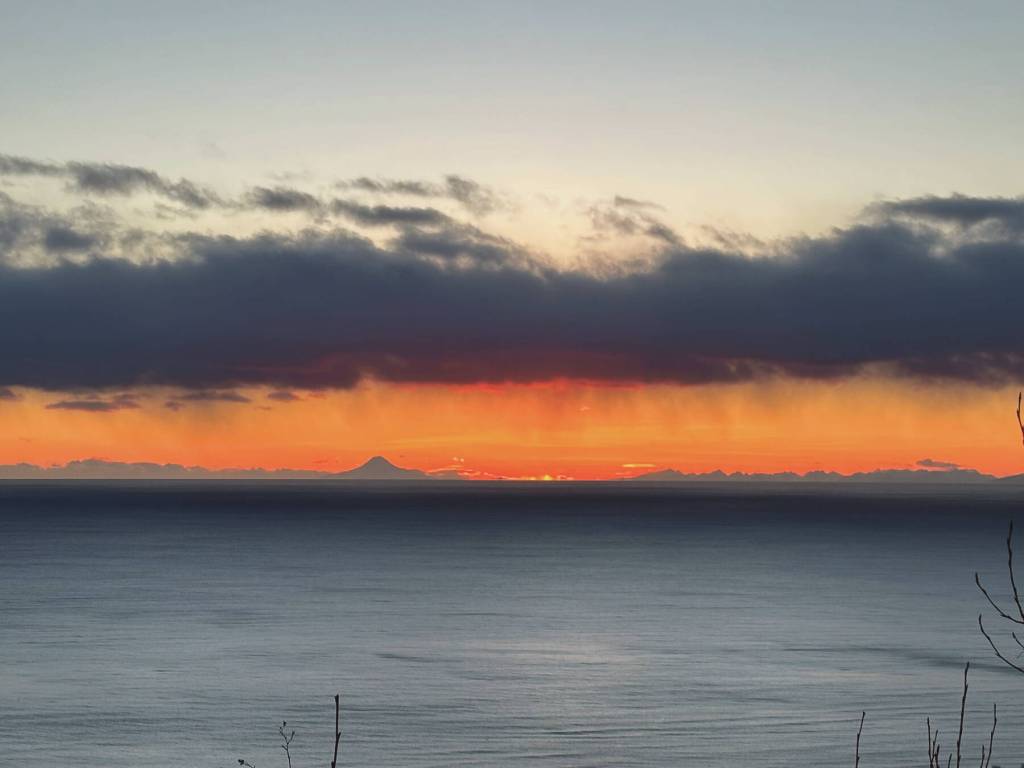 Mt. Augustine is visible in the distance looking out across Kachemak Bay as the sun sets on Wednesday, Feb. 28.