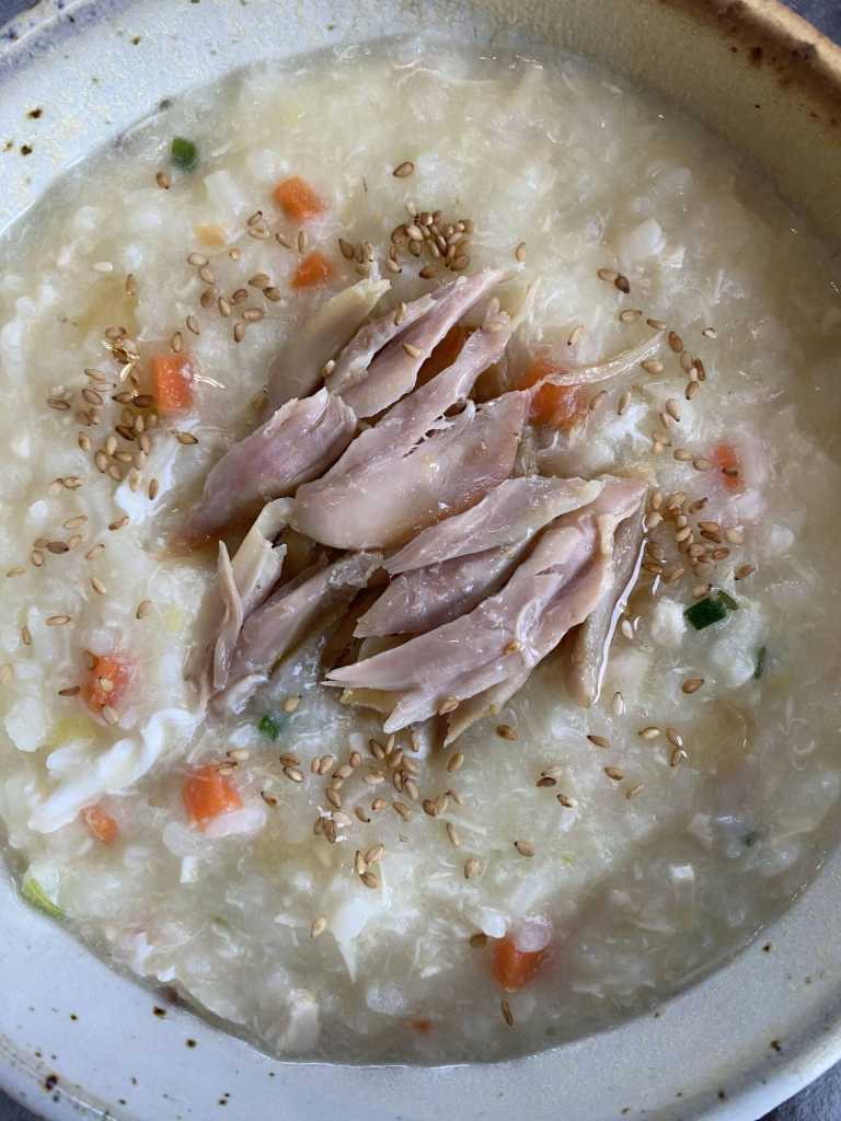 I chose to begin by preparing myself a dish that is a common first solid meal for many, many babies around the world — rice porridge. This is a Korean version, called dak juk, that is easy to digest but hearty and nutritious, perfect for when you’re learning how to eat.