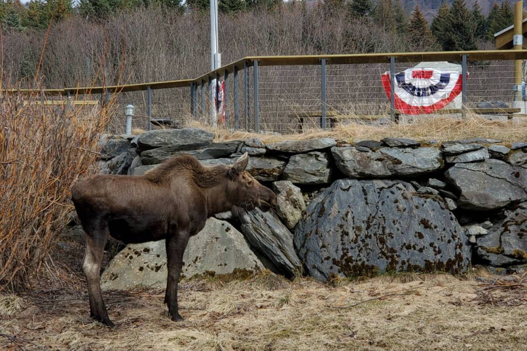 A young moose grazes next to the walking path at the Alaska Maritime National Wildlife Refuge Visitor Center on Saturday, April 20, 2024 in Homer, Alaska. (Delcenia Cosman/Homer News)