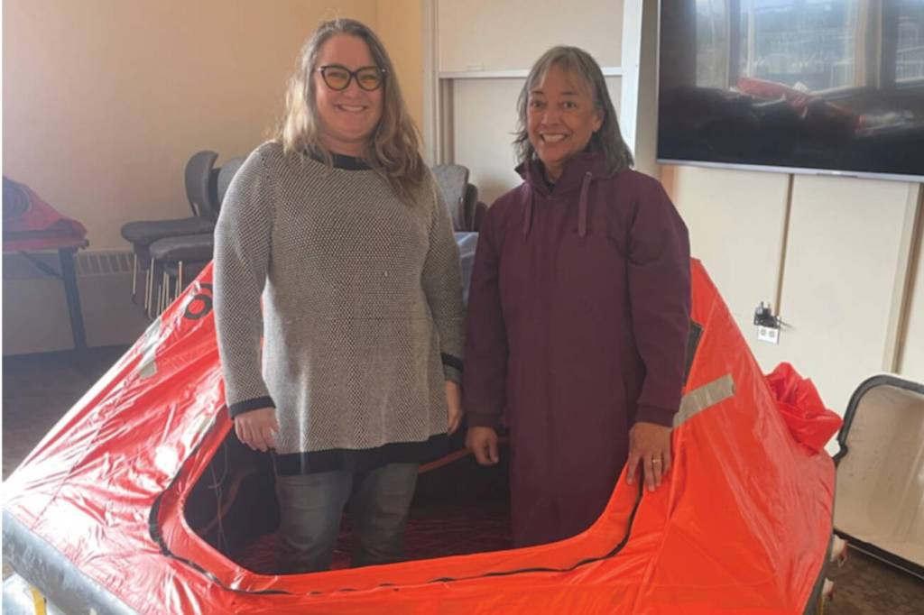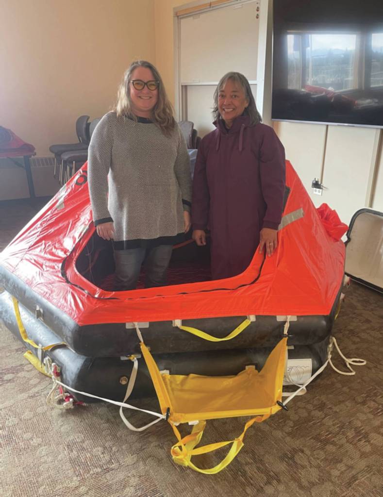 The opportunity to practice getting into a life raft in the water can be valuable for people to see what the experience is like, Harris noted. She mentioned that the device they are using for the course is designed to hold eight people but it can feel very crowded in the small space. She also noted the unstructured floor of the device and that even if a person doesn’t get sea sick on a vessel deck that might not be true in a life raft.