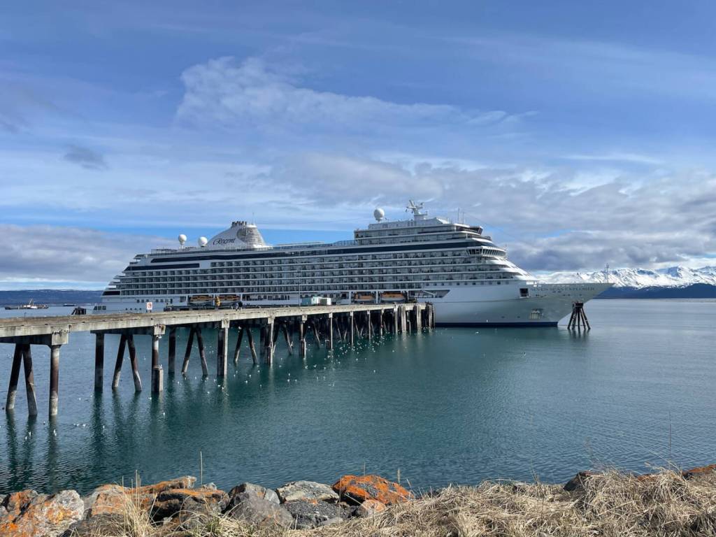 The Regent Seven Seas Explorer Cruise Ship arrives at the Deep Water Dock from Japan on Wednesday, April 24, 2024 in Homer, Alaska. (Emilie Springer/Homer News)