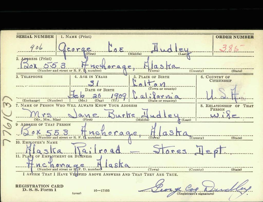 Although the timeline of Dudley’s life events is not well known, certain moments stand out. He and colleague L.E. Lind built and helped operate the Lind-Dudley Hotel in the Spenard area, and his second marriage, in 1940, was to Jane Burke McKnight, the once-divorced daughter of George Barnes Grigsby, a prominent Anchorage attorney and president of the Anchorage Bar Association.
