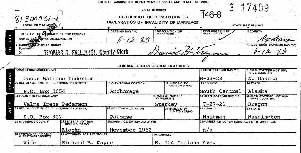 But there’s more to the story: In Anchorage in November 1962—a year and a half after Ann Pederson pulled the trigger in Soldotna—Oscar married an Oregon native and divorcee named Velma Irene (Lloyd) Starkey. That marriage, according to a Washington dissolution document, did not end officially until 1983.